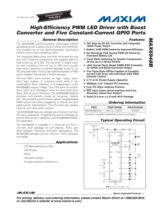 MAX6948 B High-Efficiency PWM LED Driver with Boost Converter and Five Constant-Cur...