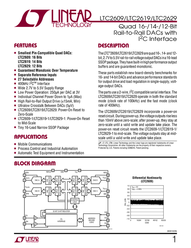 LTC2619 Quad 16-/14-/12-Bit Rail-to-Rail DACs with I²C Interface