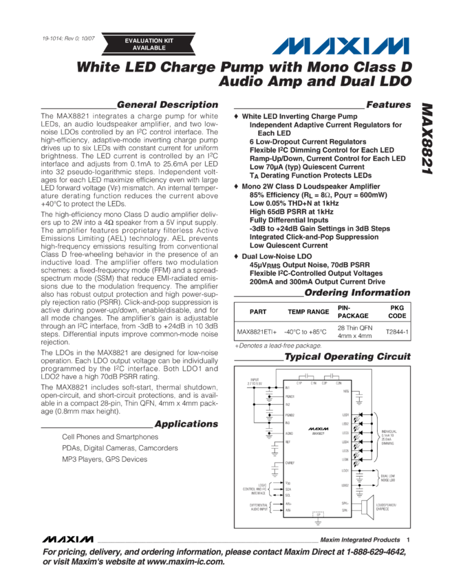 MAX8821 White LED Charge Pump with Mono Class D Audio Amp and Dual LDO