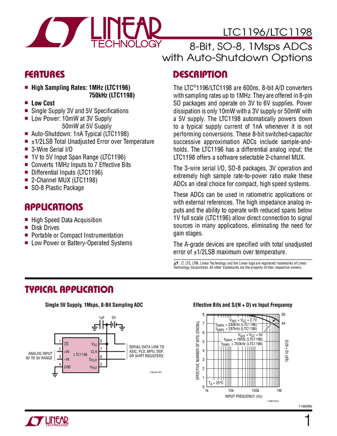 LTC1196 8-Bit, SO-8, 1Msps ADCs with Auto-Shutdown Options