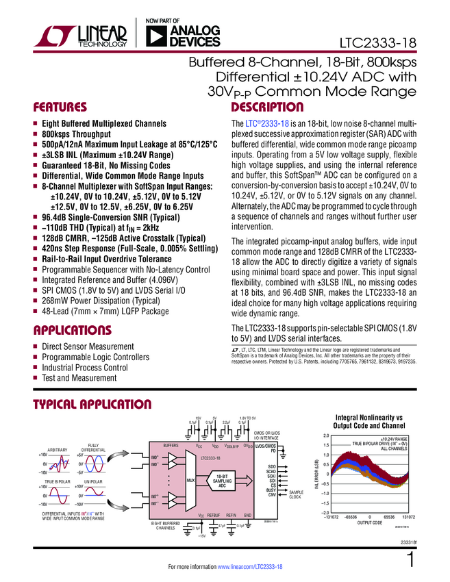 LTC2333-18 Buffered 8-Channel, 18-Bit, 800ksps Differential ±10.24V ADC with 30V Commo...