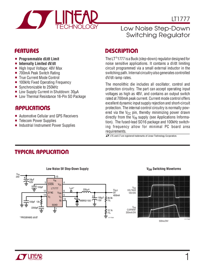 LT1777 Low Noise Step-Down Switching Regulator