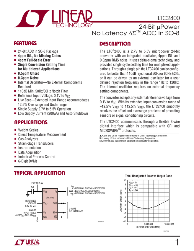 LTC2400 24-Bit µPower No Latency ∆Σ ADC in SO-8