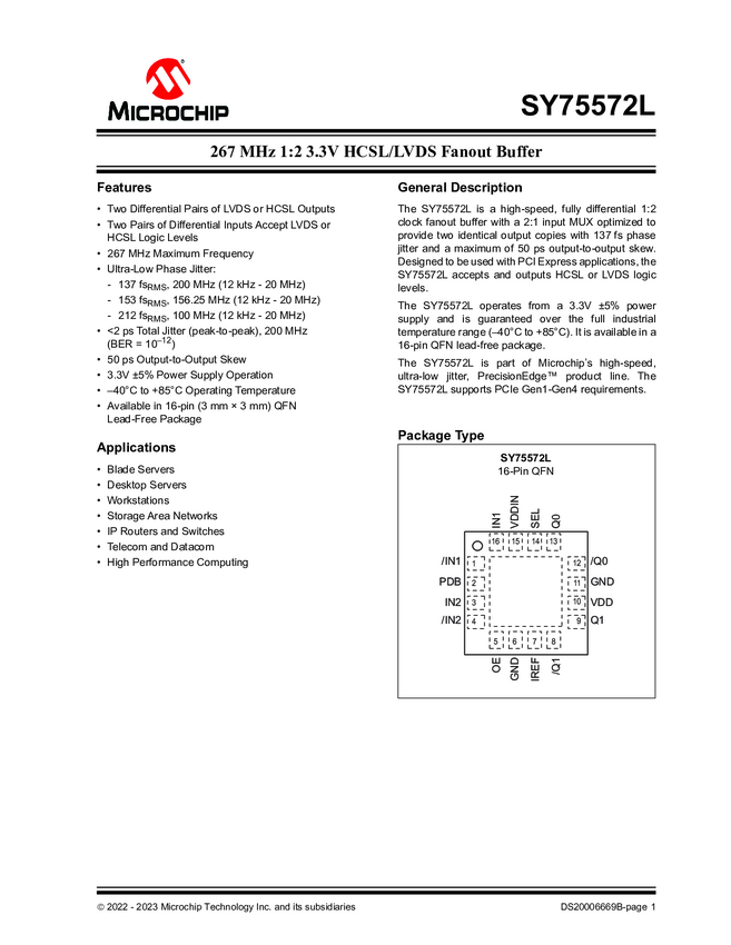 SY75572L 267MHz 1:2 3.3V HCSL/LVDS Fanout Buffer