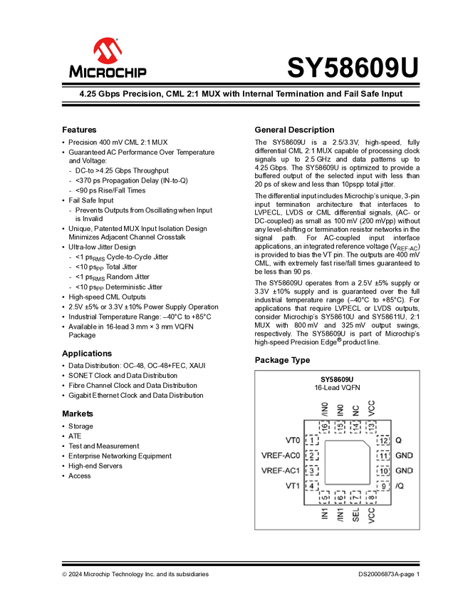 SY58609U 4.25 Gbps Precision, CML 2:1 MUX with Internal Termination and Fail Safe In...