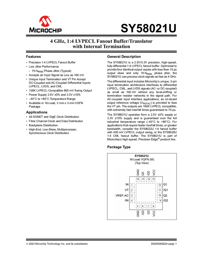SY58021U 4GHz, 1:4 LVPECL Fanout Buffer/Translator with Internal Termination