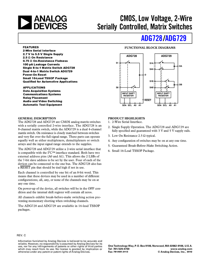 ADG728 CMOS, Low Voltage, 2 Wire, Serially Controlled Dual 4 to 1 Matrix Switch