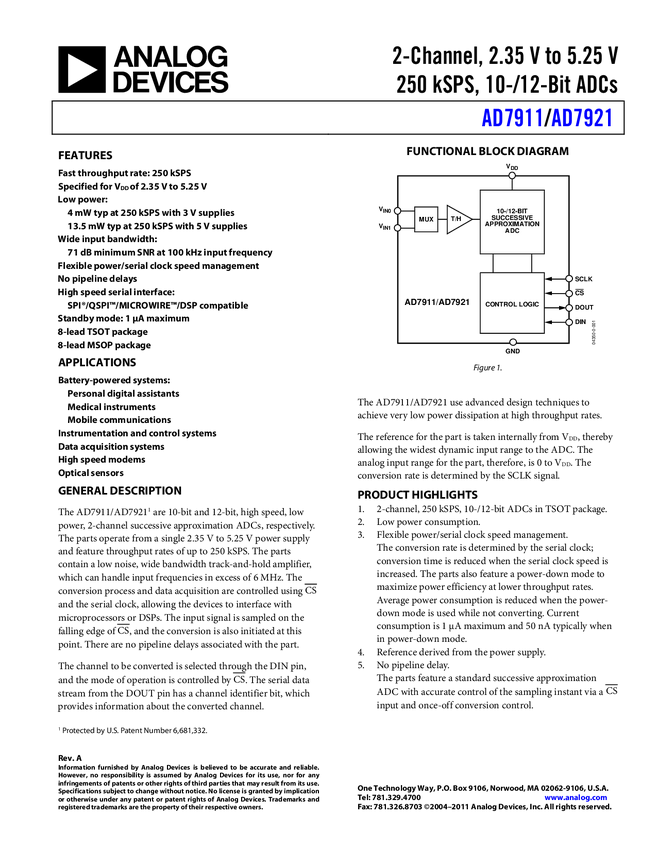 AD7911 2-Channel, 2.35 V to 5.25 V, 250 kSPS, 12-Bit A/D Converter