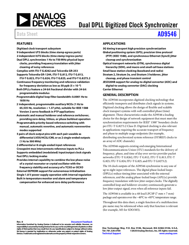 AD9546 Dual DPLL Digitized Clock Synchronizer