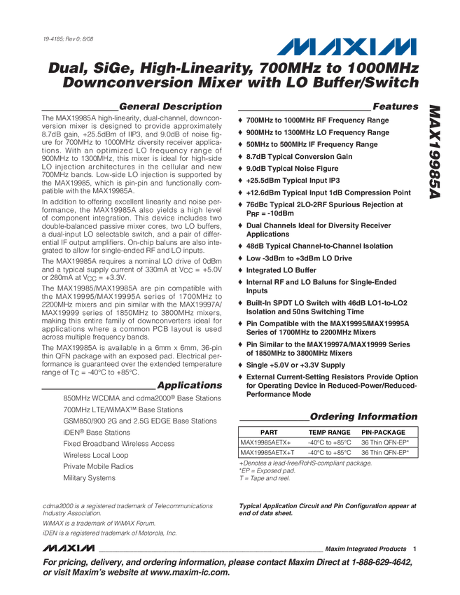 MAX19985A Dual, SiGe, High-Linearity, High-Gain, 700MHz to 1000MHz Downconversion Mix...