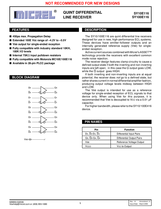 SY10E116 SY10/100E116 - Quint Differential Line Receiver