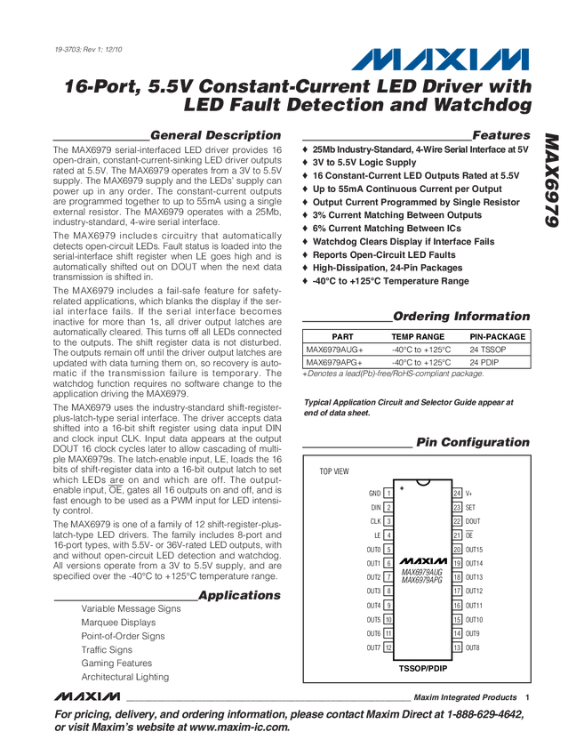MAX6979 16-Port, 5.5V Constant-Current LED Driver with LED Fault Detection and Watc...