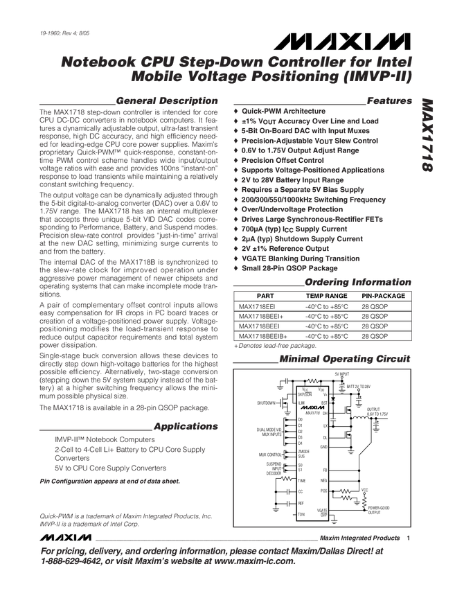 MAX1718 Notebook CPU Step-Down Controller for Intel Mobile Voltage Positioning (IMV...