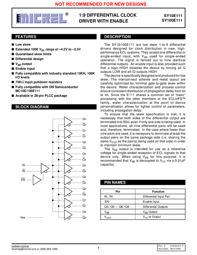 SY10/100E111 - 1:9 Differential Clock Driver With Enable