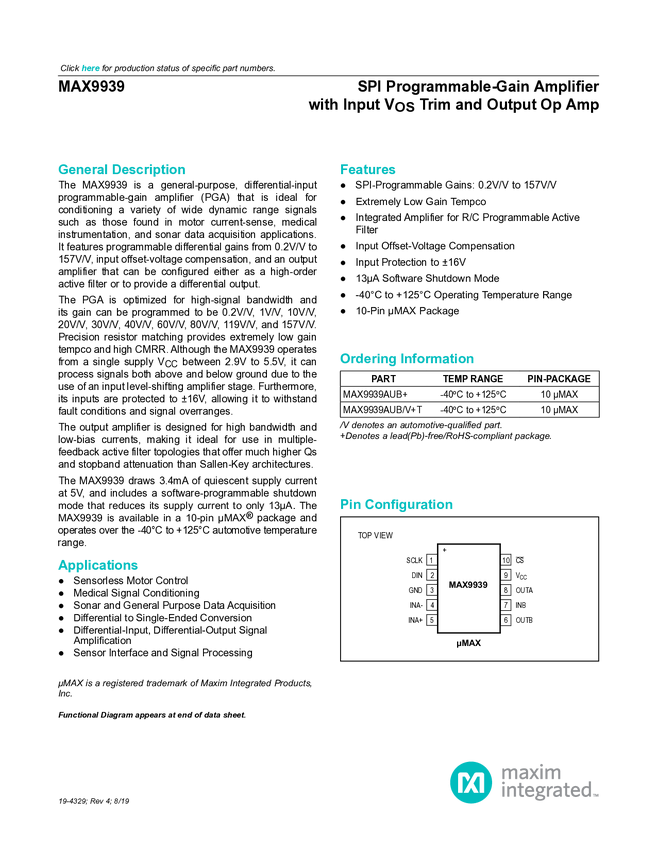 MAX9939 SPI-Programmable Gain Amplifier (PGA) with Input V Trim and Output Op Amp