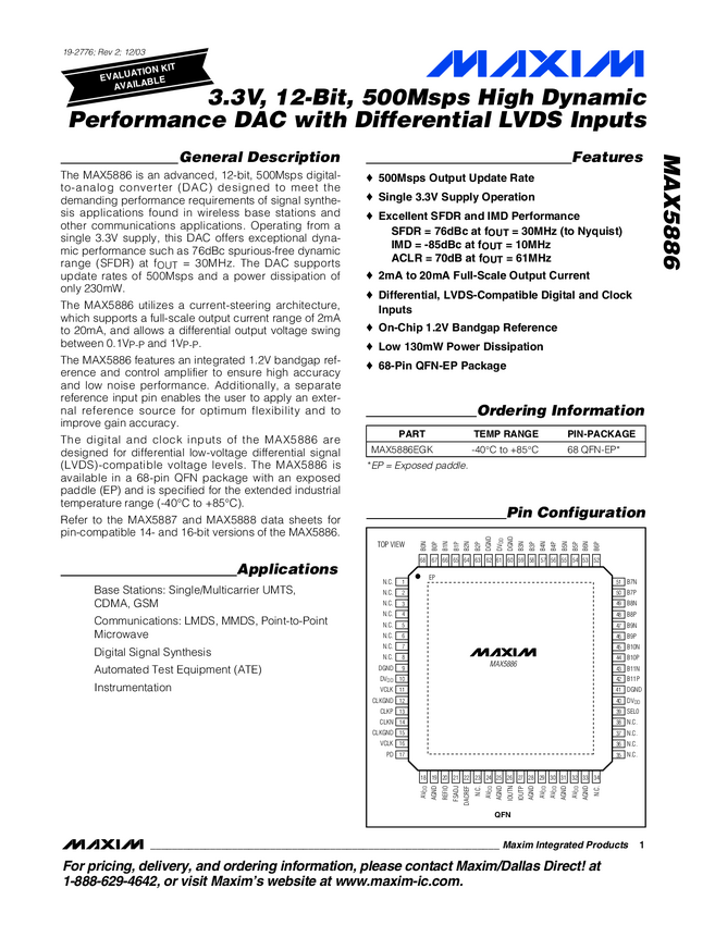 MAX5886 3.3V, 12-Bit, 500Msps High Dynamic Performance DAC with Differential LVDS I...