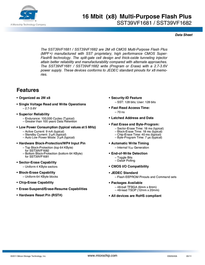 SST39VF1681 / SST39VF1682 Data Sheet - 16 Mbit (x8) Multi-Purpose Flash Plus