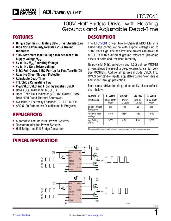 LTC7061 100V Half Bridge Driver with Floating Grounds and Adjustable Dead-Time