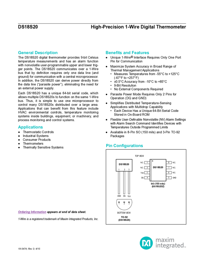 DS18S20 1-Wire Parasite-Power Digital Thermometer