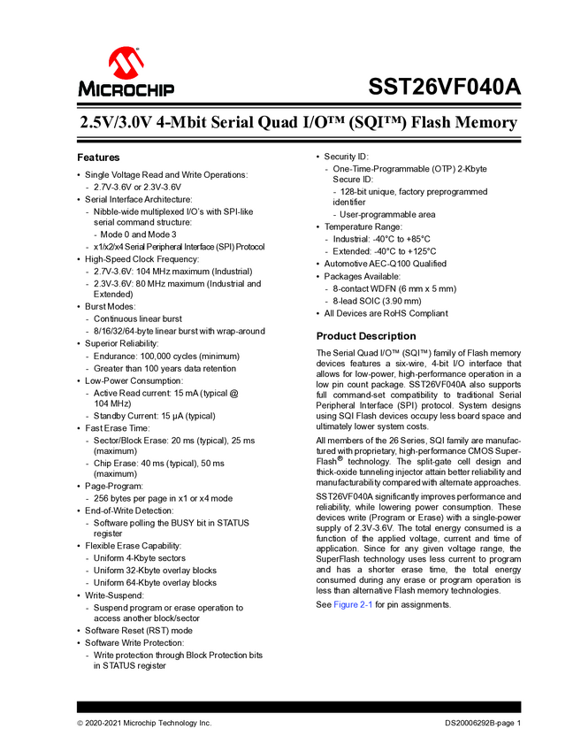 SST26VF040A - 2.5V/3.0V 4-Mbit Serial Quad I/O™ (SQI™) Flash Memory