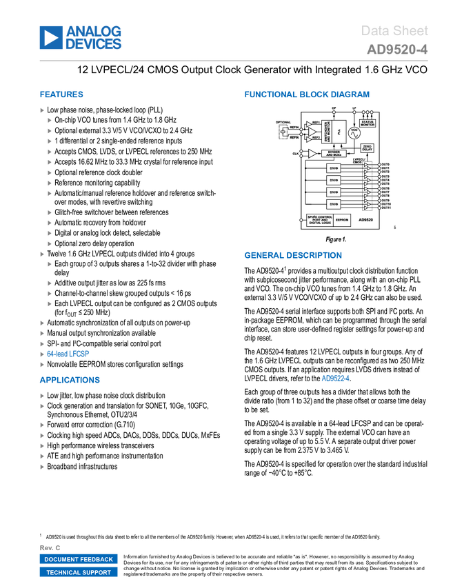 AD9520-4 12 LVPECL/24 CMOS Output Clock Generator with Integrated 1.6 GHz VCO