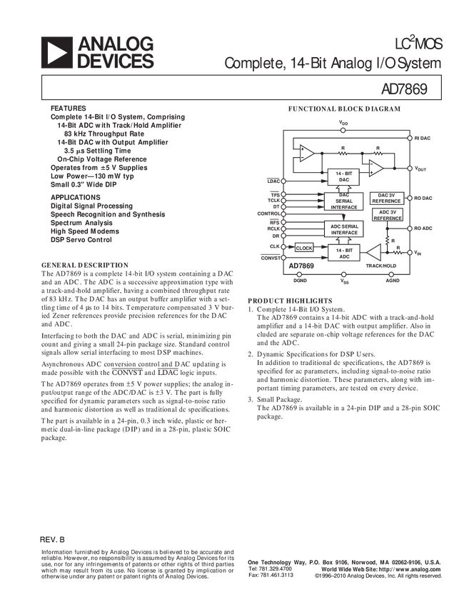 AD7869 CMOS, Complete 14-Bit Analog I/O System