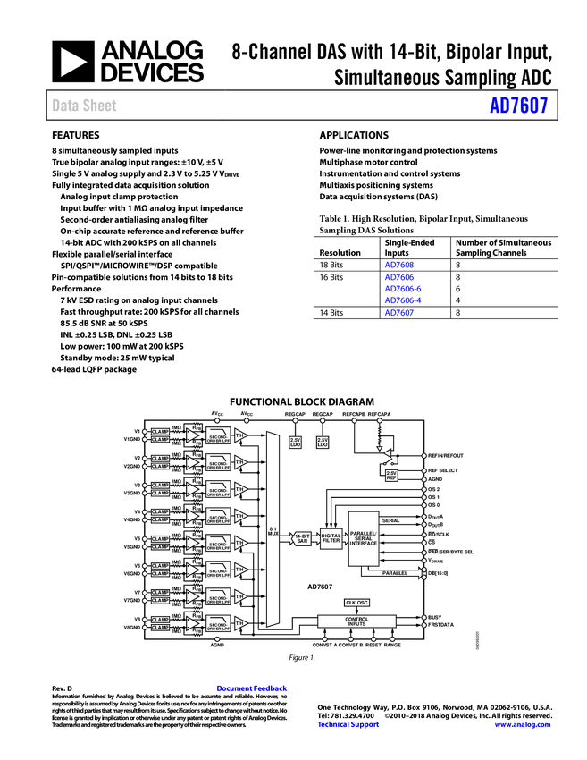 AD7607 8-Channel DAS with 14-Bit, Bipolar, Simultaneous Sampling ADC