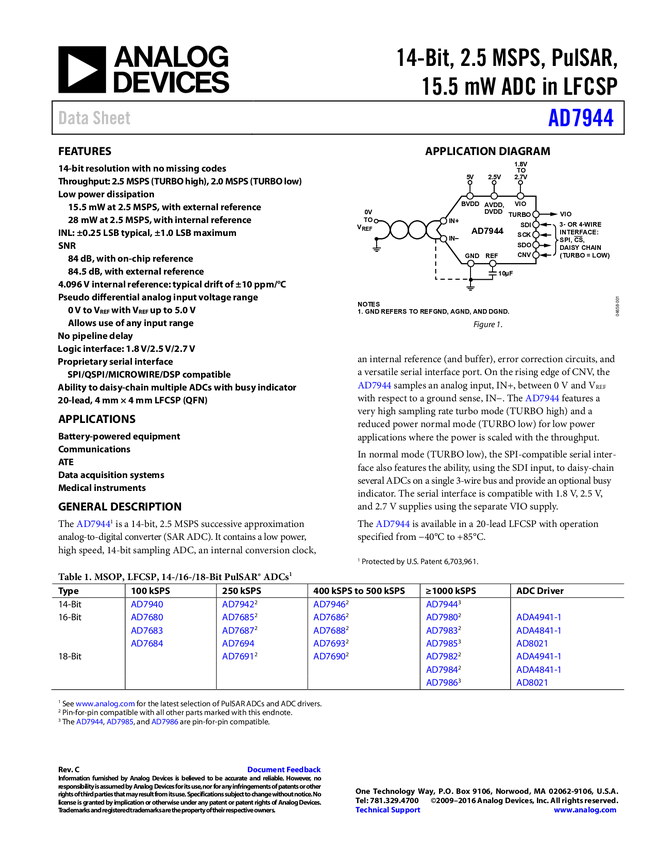 AD7944 14-Bit, 2.5 MSPS, PulSAR 15.5 mW ADC in LFCSP