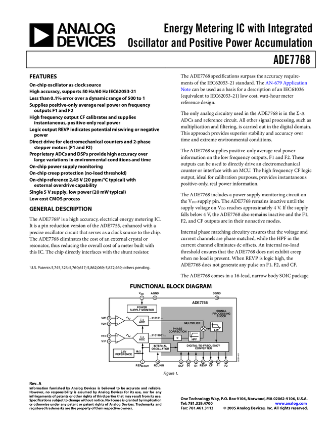 ADE7768 Single Phase Energy Metering IC with Integrated Oscillator and Positive Onl...