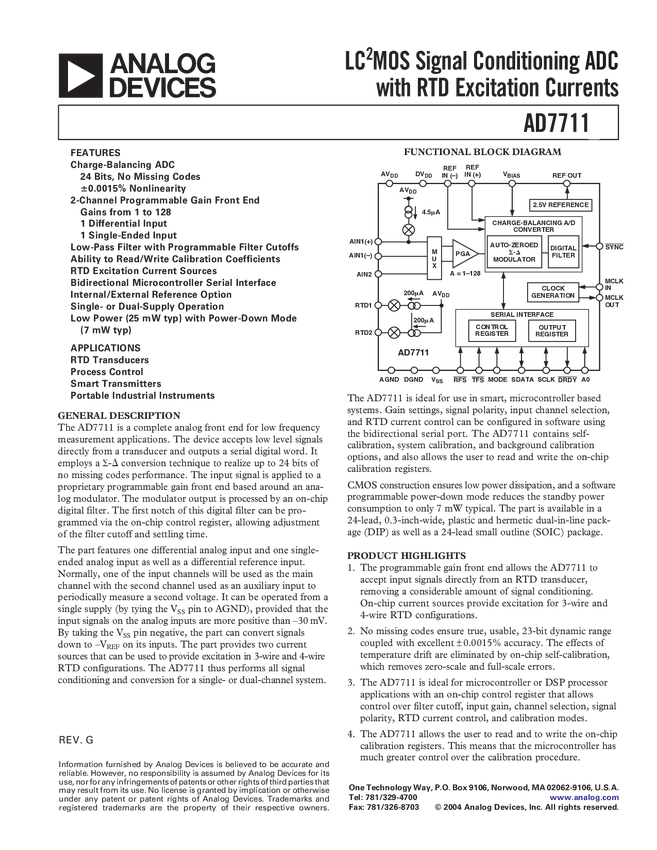 AD7711 CMOS, 24-Bit Sigma-Delta, Signal Conditioning ADC with Matched RTD Excitat...