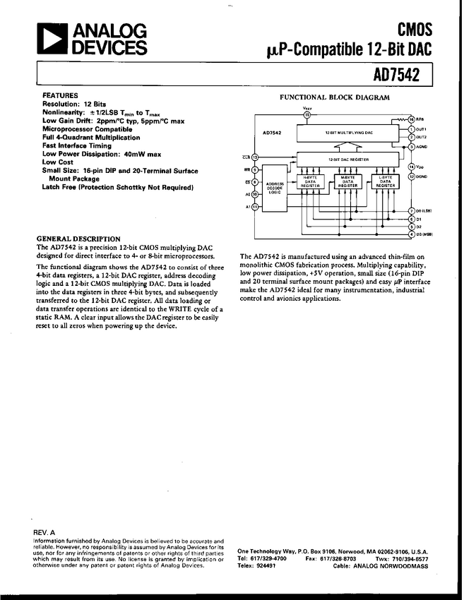 AD7542 Precision 12-Bit CMOS Multiplying I DAC, 4-Bit Bus