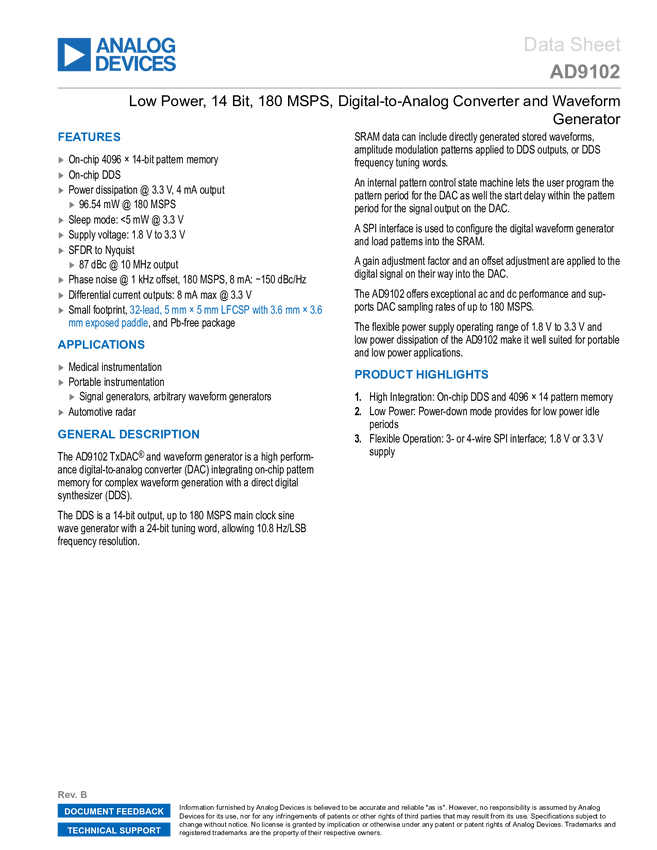 AD9102 Low Power, 14-Bit, 180 MSPS, Digital-to-Analog Converter and Waveform Gener...