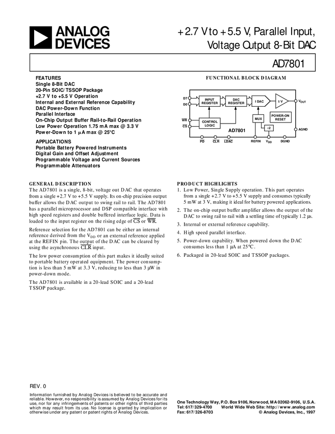 AD7801 +2.7 V to +5.5 V, Parallel Input, Voltage Output 8-Bit DAC