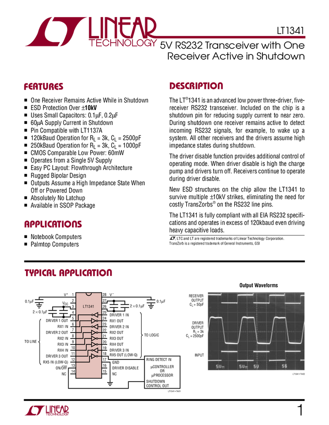LT1341 5V RS232 Transceiver with One Receiver Active in SHUTDOWN