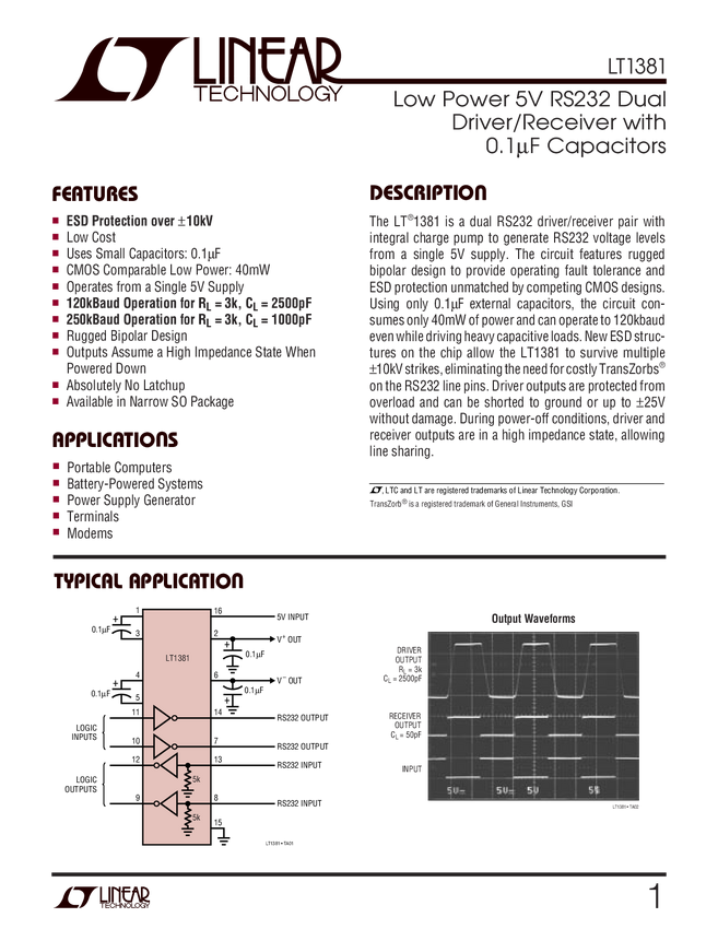 LT1381 Low Power 5V RS232 Dual Driver/Receiver with 0.1µF Capacitors