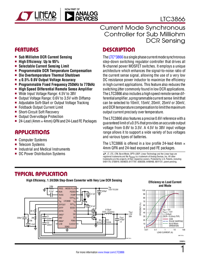LTC3866 Current Mode Synchronous Controller for Sub Milliohm DCR Sensing