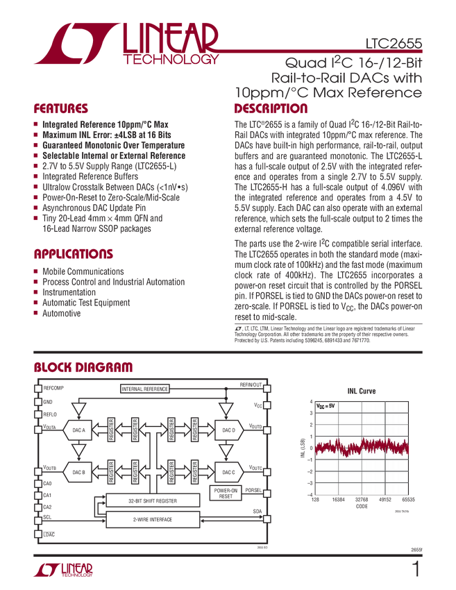 LTC2655 Quad IC 16-/12-Bit Rail-to-Rail DACs with 10ppm/°C Max Reference