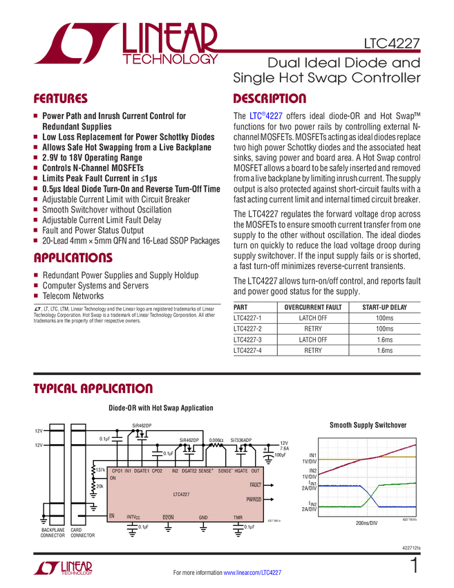 LTC4227 Dual Ideal Diode and Single Hot Swap Controller