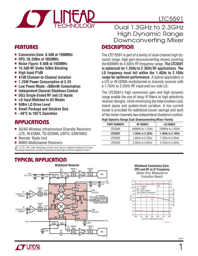 LTC5591 Dual 1.3GHz to 2.3GHz High Dynamic Range Downconverting Mixer