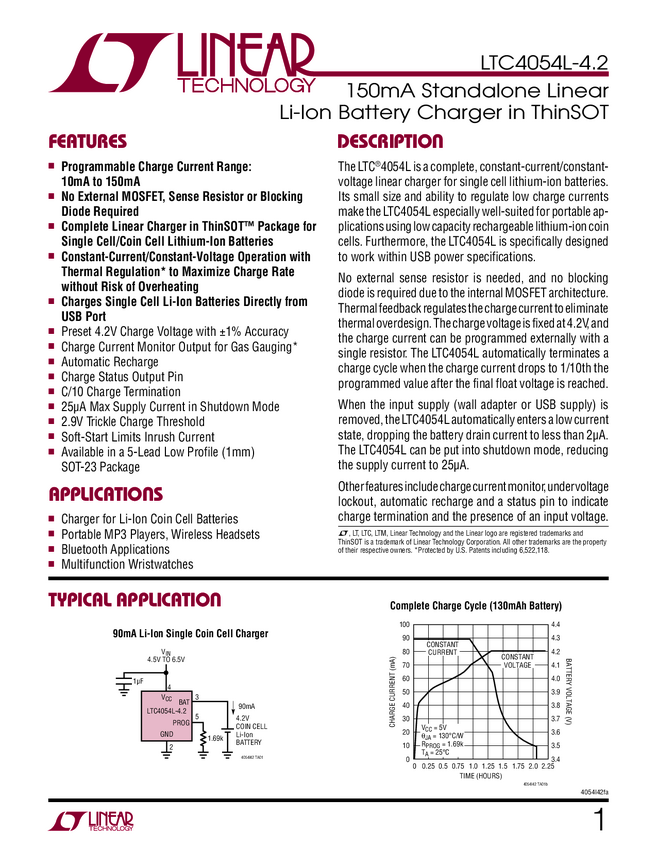 LTC4054L-4.2 150mA Standalone Linear Li-Ion Battery Charger in ThinSOT