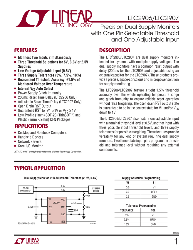 LTC2906 Precision Dual Supply Monitors with One Pin-Selectable Threshold and One Ad...