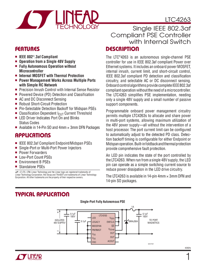 LTC4263 Single IEEE 802.3af Compliant PSE Controller with Internal Switch