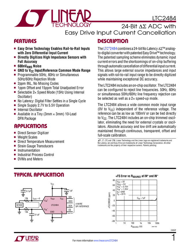 LTC2484 24-Bit ΔΣ ADC with Easy Drive Input Current Cancellation