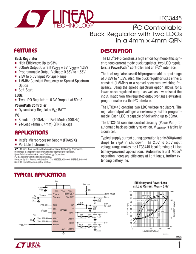 LTC3445 I²C Controllable Buck Regulator with Two LDOs in a 4mm × 4mm QFN