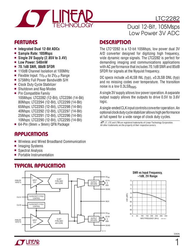 LTC2282 Dual 12-Bit, 105Msps Low Power 3V ADC