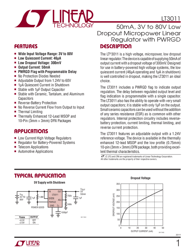 LT3011 50mA, 3V to 80V Low Dropout Micropower Linear Regulator with PWRGD