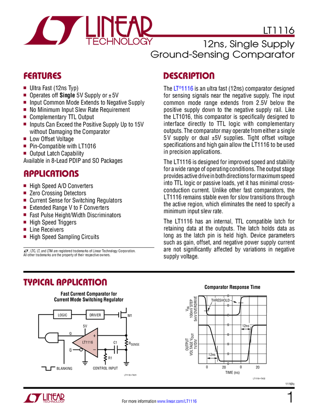 LT1116 12ns, Single Supply Ground-Sensing Comparator
