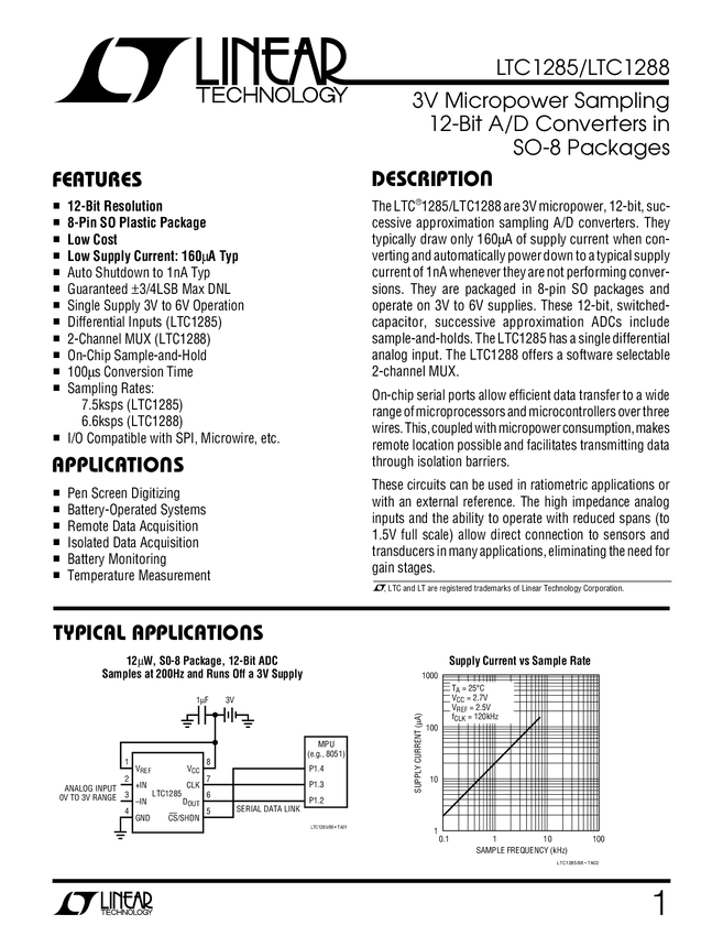 LTC1285 3V Micropower Sampling 12-Bit A/D Converters in SO-8 Packages
