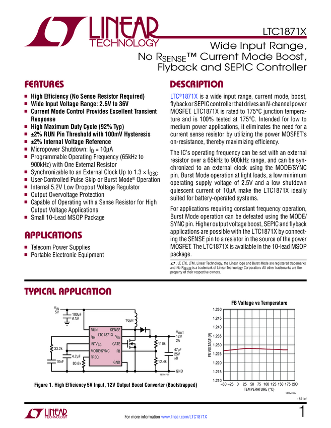 LTC1871X Wide Input Range, No R Current Mode Boost, Flyback and SEPIC Controller