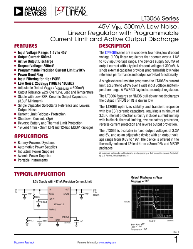 LT3066 45V V, 500mA Low Noise, Linear Regulator with Programmable Current Limit an...